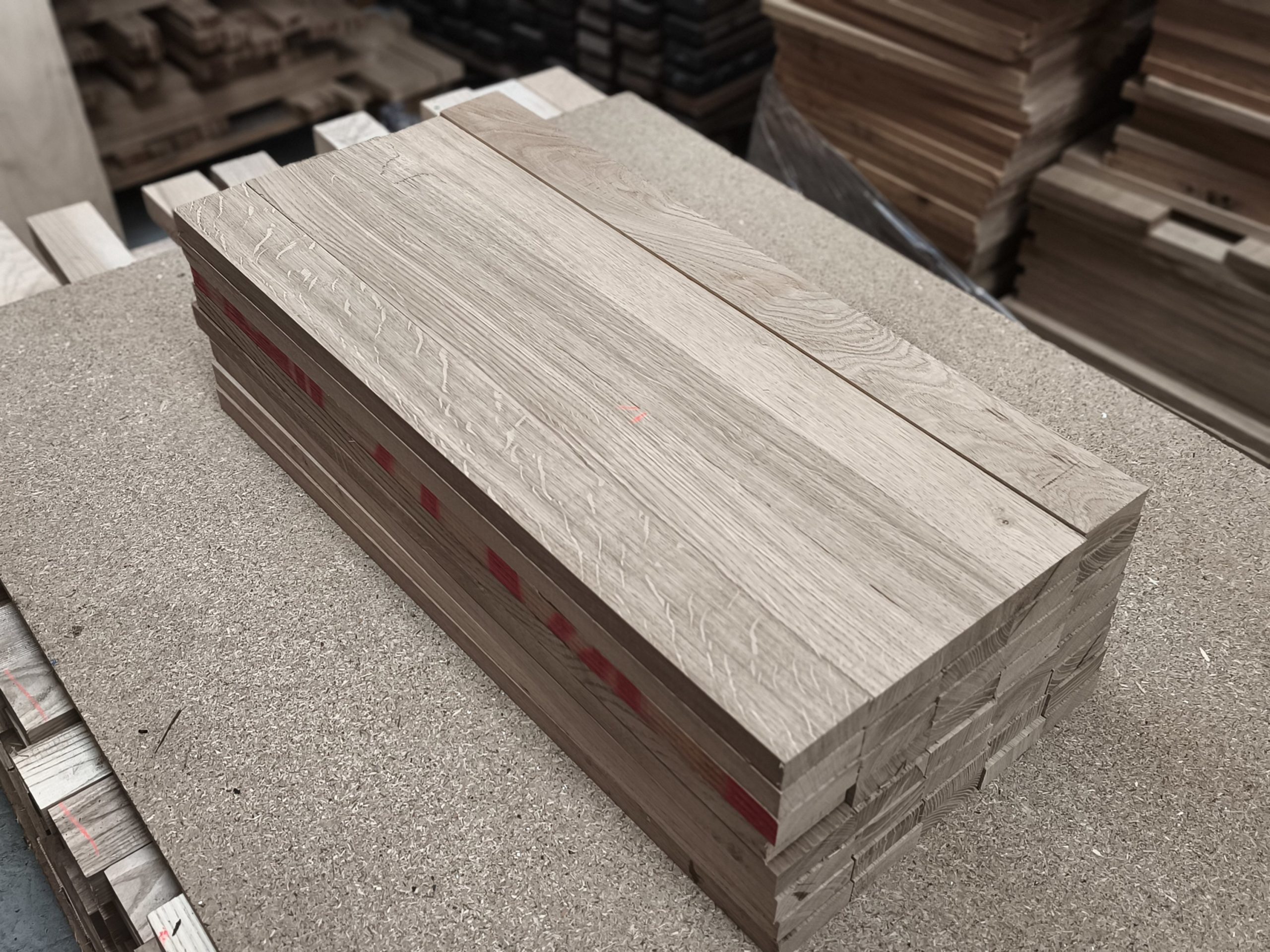 Fryza dąb europejski 55x20mm. Fryza po suszarni, wilgotność do 10%, dwie strony strugane, dwie po pile. Klasa AA i AB mix. Na lewej stronie możeliwy mały sęk lub wgniotki od posuwu strugarki. Fryza jest cięta z lekkim „plusem” na długość. Układ słojów oraz sęków może różnić się od tych na zdjęciu poglądowym. Jest to naturalna cecha drewna- każdy kawałek jest wyjątkowy. Cena podana za sztukę fryzy. Przy większym zamówieniu poza stanem magazynowym proszę o kontakt poprzez email.