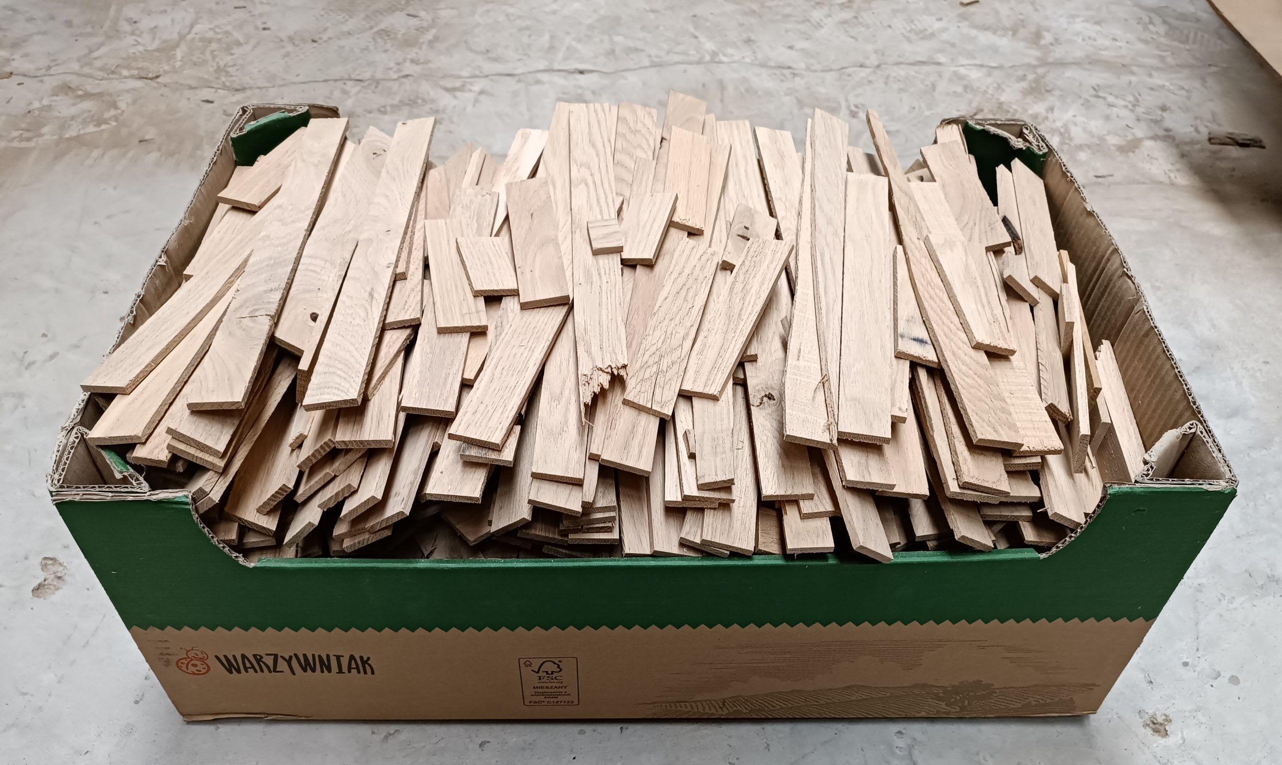Ścinki lameli dębowych, po docinaniu. Po suszarni, wilgotność do 10%. Fajny materiał jeszcze do wykorzystania niekoniecznie na opał.